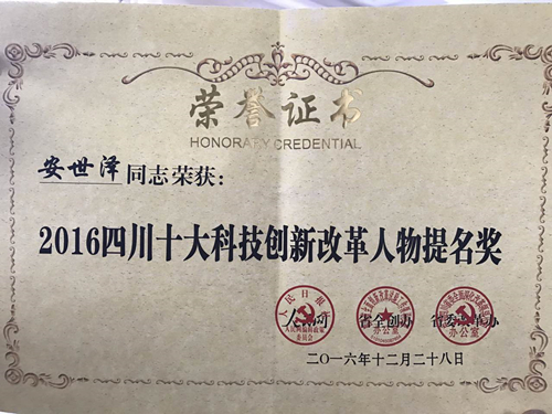 院長安世澤獲 “2016四川十大科技創(chuàng)新改革人物”提名獎(jiǎng)
