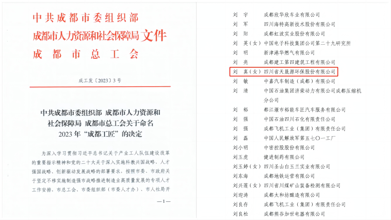 2023年5月5日,“成都工匠命名大會(huì)”在天府國(guó)際會(huì)議中心舉行,四川省天晟源環(huán)保股份有限公司(簡(jiǎn)稱“天晟源環(huán)?!保?/span>劉真同志在大會(huì)上被授予“成都工匠”榮譽(yù)稱號(hào),天晟源環(huán)保工會(huì)主席、副總經(jīng)理李美玲代表企業(yè)參加大會(huì)。